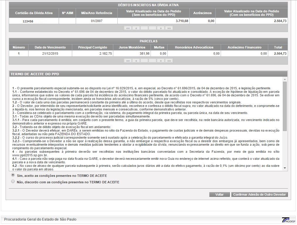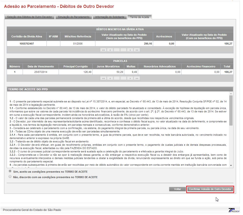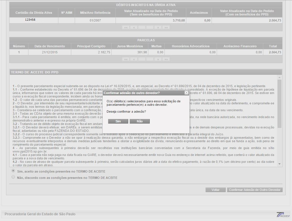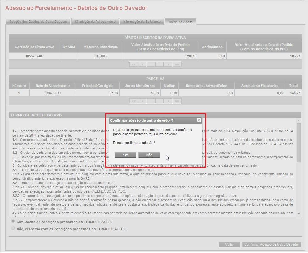 8. Na tela “Termo de Aceite”, o botão “Confirmar adesão de Outro Devedor” será exibido. Ao clicar nesse botão, é exibido um aviso de confirmação que um débito de outro