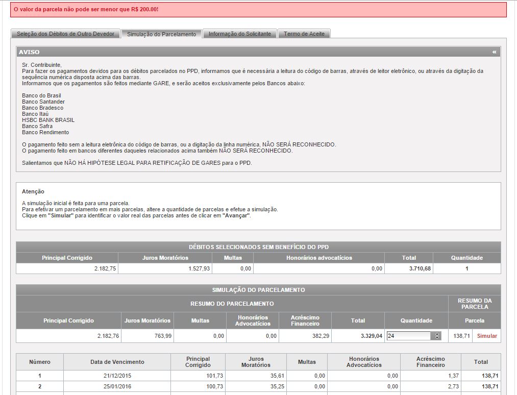 • todos os débitos selecionados devem ser do mesmo devedor, ou seja, não é permitido juntar débitos de devedores diferentes no mesmo parcelamento